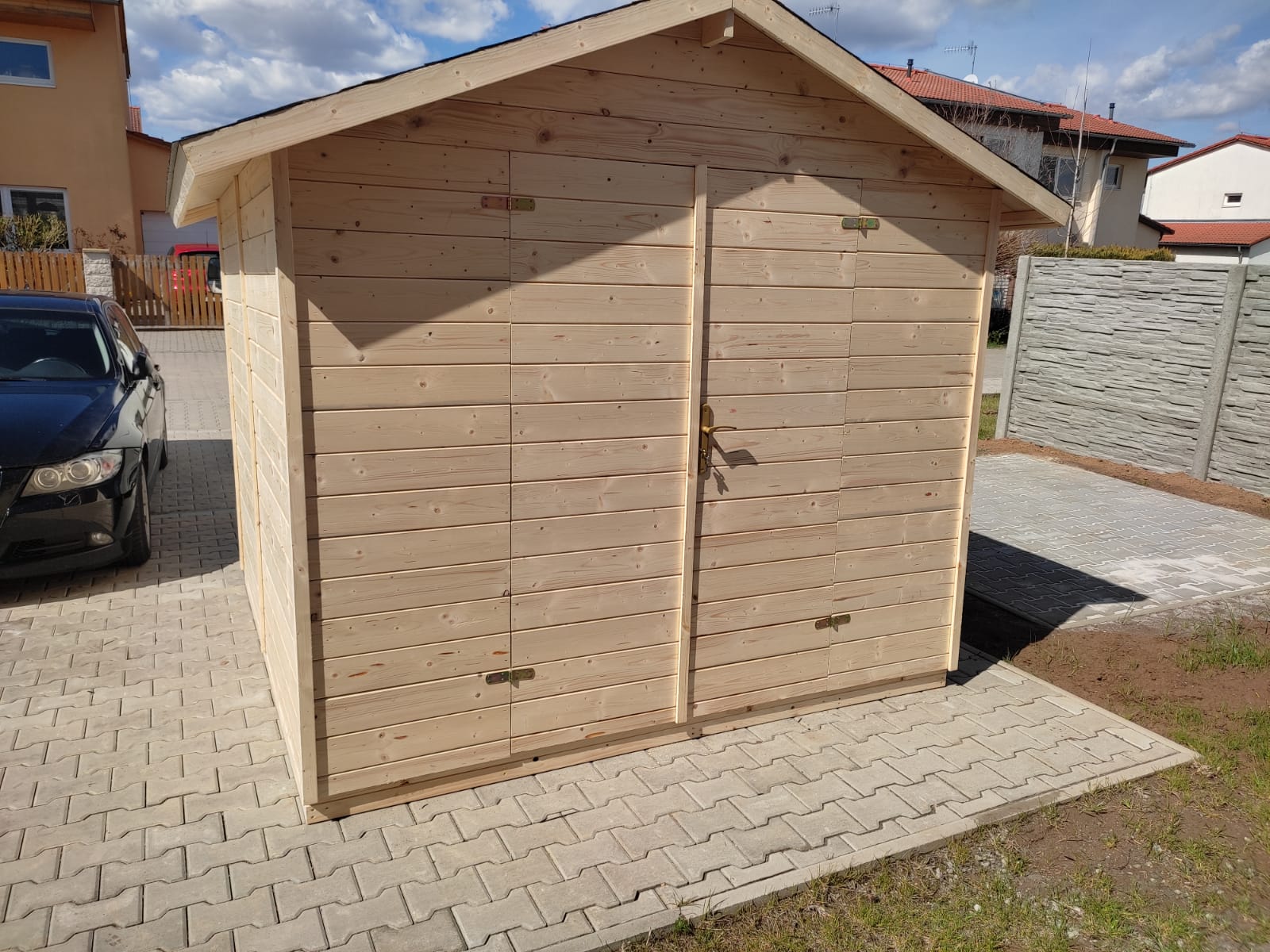 Domek má dvoukřídlé dveře o rozměru 120×180 cm (rozměr jednoho křídla je 60×180).