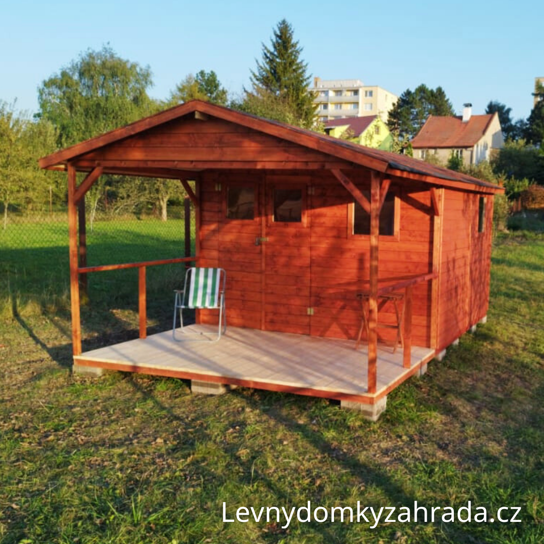 Zahradní dřevěný domek s okny, který má rozměr 3 m x 5 m. Celková plocha tvoří 15 m2.
